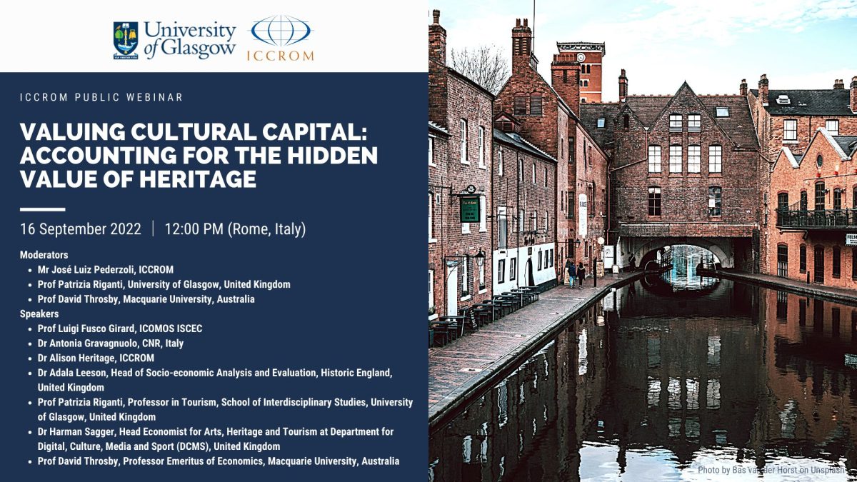 The International Centre for the Study of the Preservation and Restoration of Cultural Property (ICCROM) will hold a webinar on September 16th entitled "Valuing Cultural Capital: accounting for the hidden value of heritage".