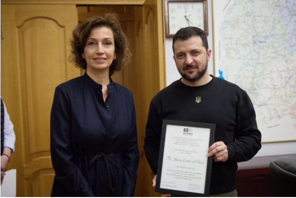 La Directora de la Organización finalizó su visita a Ucrania en Odesa, cuyo centro histórico fue inscrito por la UNESCO en la Lista del Patrimonio Mundial en Peligro a finales de enero de este año. Tras esta inscripción, la UNESCO pretende reforzar más las acciones sobre el terreno, dando prioridad a la preservación y digitalización del patrimonio artístico y documental, así como a la protección de los edificios patrimoniales en peligro por el fuego de artillería.
