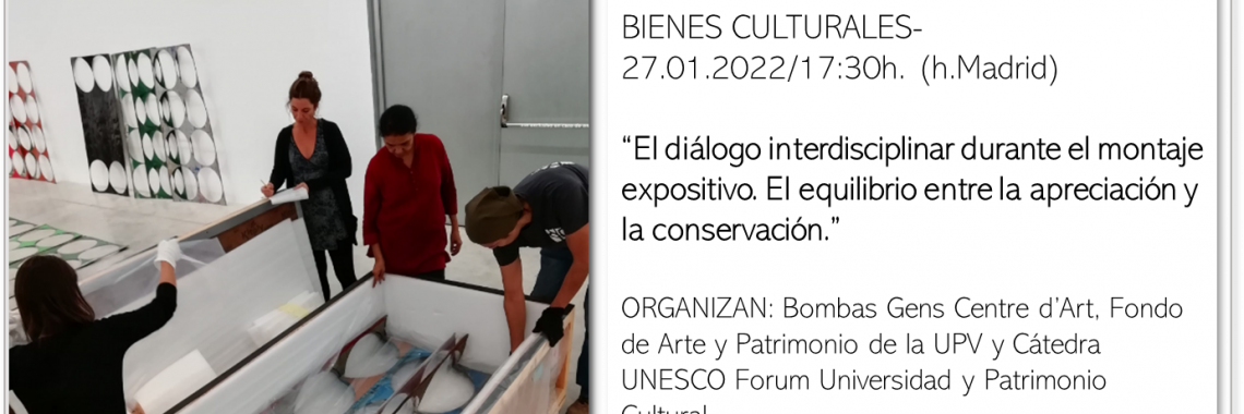 27.01.2022/17:30h. (h.Madrid) “El diálogo interdisciplinar durante el montaje expositivo. El equilibrio entre la apreciación y la conservación.” ORGANIZAN: Bombas Gens Centre d’Art, Fondo de Arte y Patrimonio de la UPV